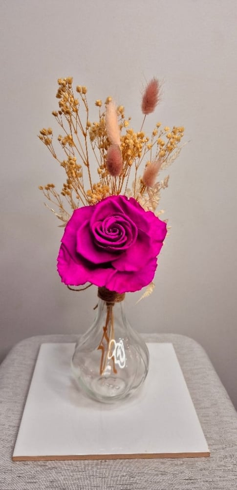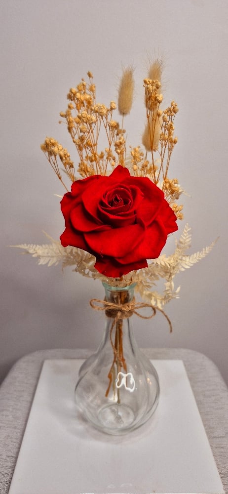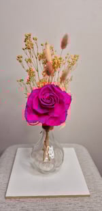 Our preserved flower bud vases feature open roses, white fern, gypsophila and bunny tail. Choose from cerise pink or ruby red roses.